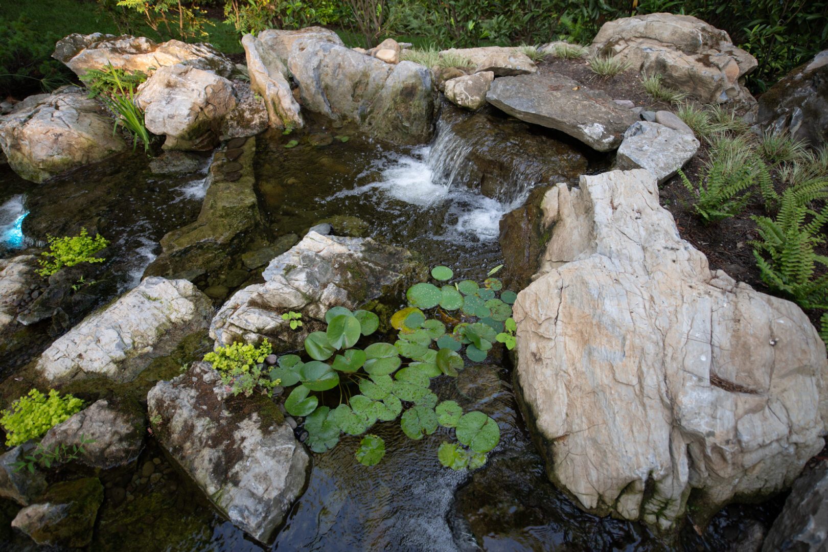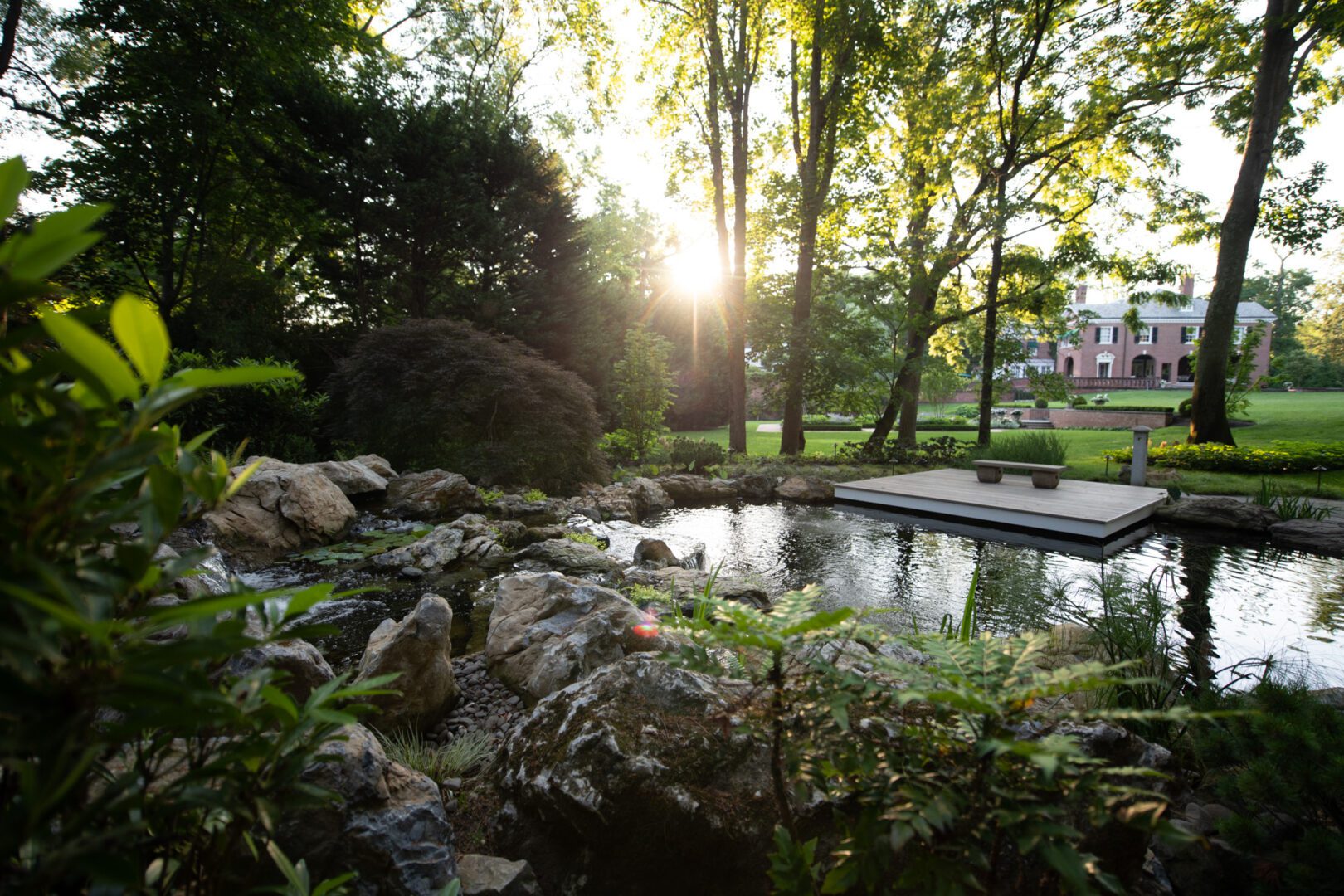 We designed and built a naturalistic Koi Pond featuring a tranquil waterfall feature, IPE decking that cantilevers over the pond, and natural stone pathways.